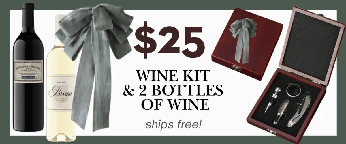 Don’t want to mess with working the system? How about a one time wine deal with a gift? This kit is $25 you get a fancy wood box of wine tools plus 2 bottles of wine shipped! Click here.