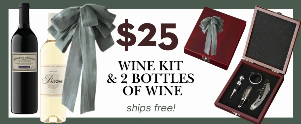 - Wine Gift: Buy a wine kit $25 (it’s a nice wood box of wine tools) and receive 2 FREE bottles of wine of your choice ($25 total shipped). I just ordered one of these, but I don’t have it yet. What a great deal for hosting or as a hostess gift! Not a subscription*