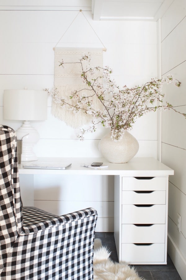 Of course I wanted to add some beauty without filling up my small office with a bunch of stuff. This wide mouth textured vase adds a ton of style and is perfect for yard cuttings–my favorite kind of green to bring inside.