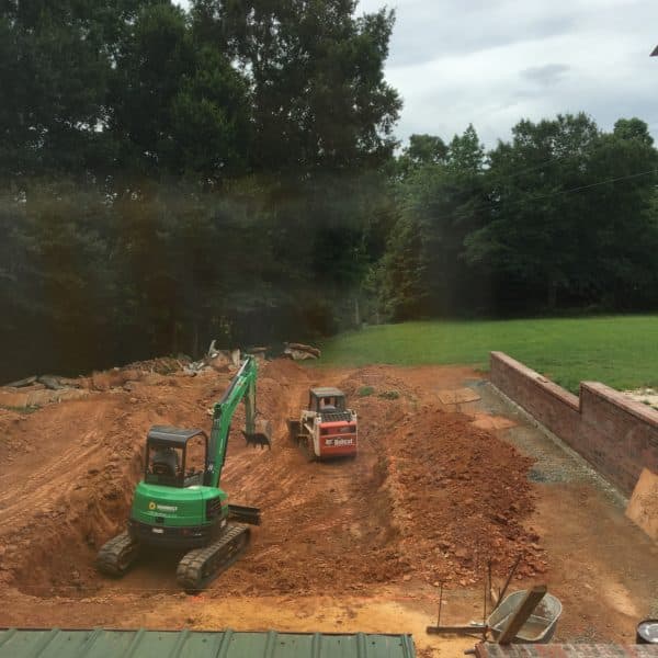 Y’all, I’m not even going to try to show you seven months of work in the exact order or explain every single decision. For a few months we/they were just doing things like removing the old pool, removing the old retaining wall on the main side of the pool, moving dirt, and building a new long retaining wall and redigging the pool in its new location and then putting forms in that. It’s lots of red clay, wood and more red clay and machines.