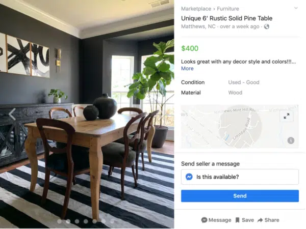 Just for fun I hopped on FBM to see what I could find to share an example here. I love this gorgeous table (asking $400–always ask if they’ll take less) and I think I saw the chairs in a separate listing. If you’re in the Charlotte area and need a table, what a great find.