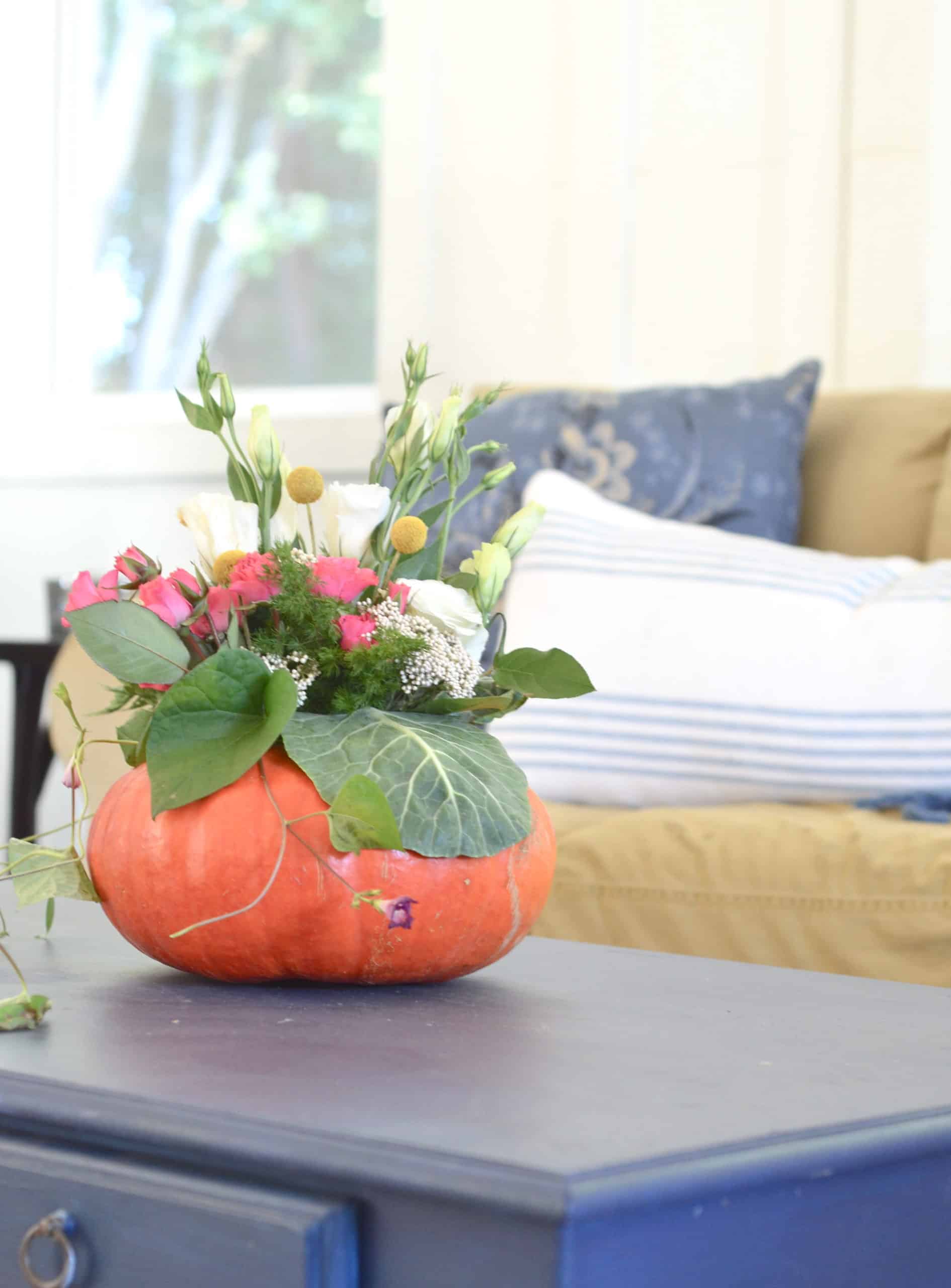 The trick to a pretty pumpkin centerpiece is to have leaves or vines or flowers that cross the border between pumpkin and flower arrangement.
